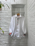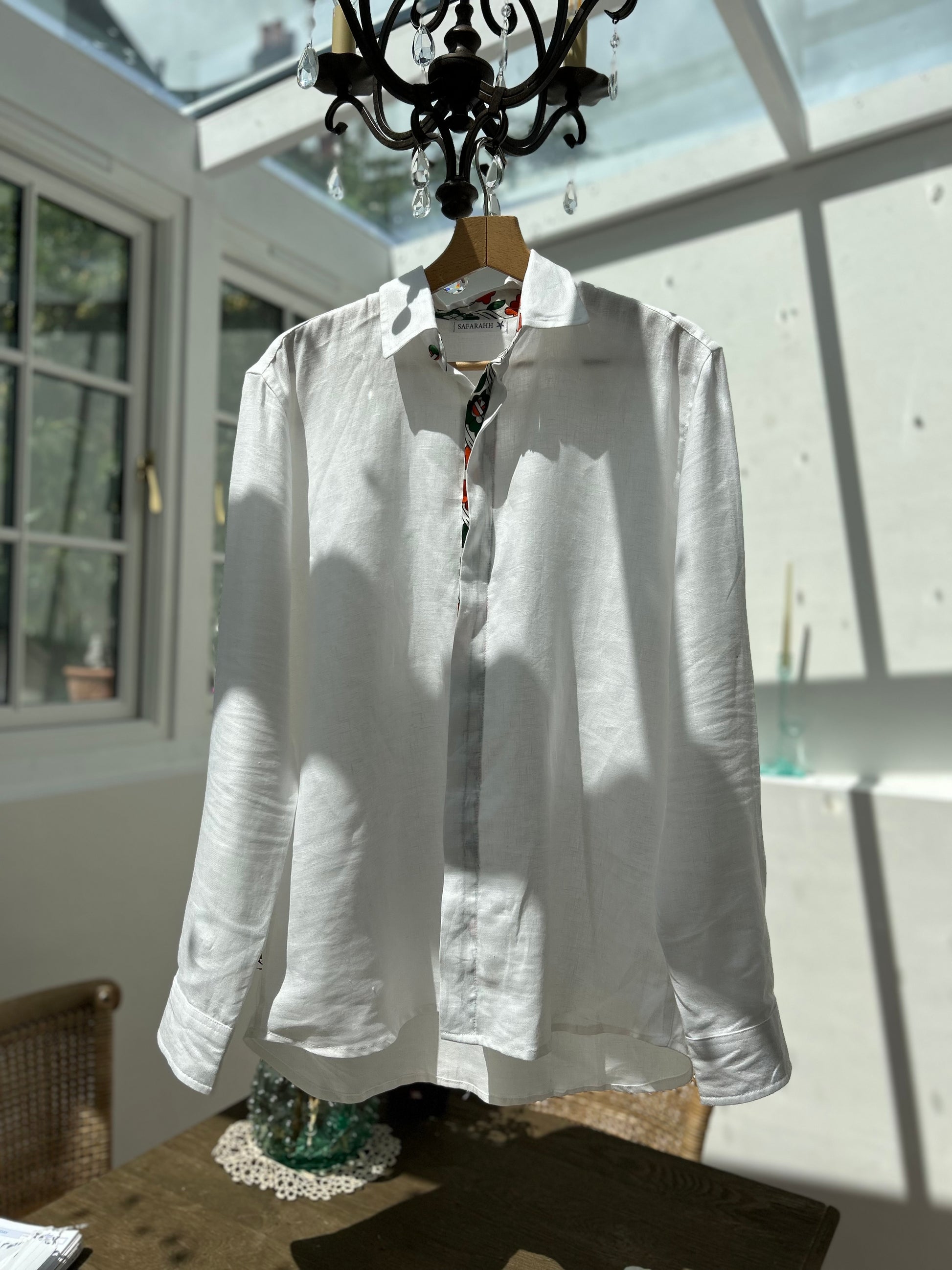 Our first drop for men, but also known to be loved and worn by women, is the Cresent Island Mens Shirt. Its an elegant wardrobe staple, but in true Safarahh style is has a little more pizzazz than the ordinary white linen shirt. The Kanga print is placed subtly on the inside of the cuffs, collar and the hidden panel where the buttons live.