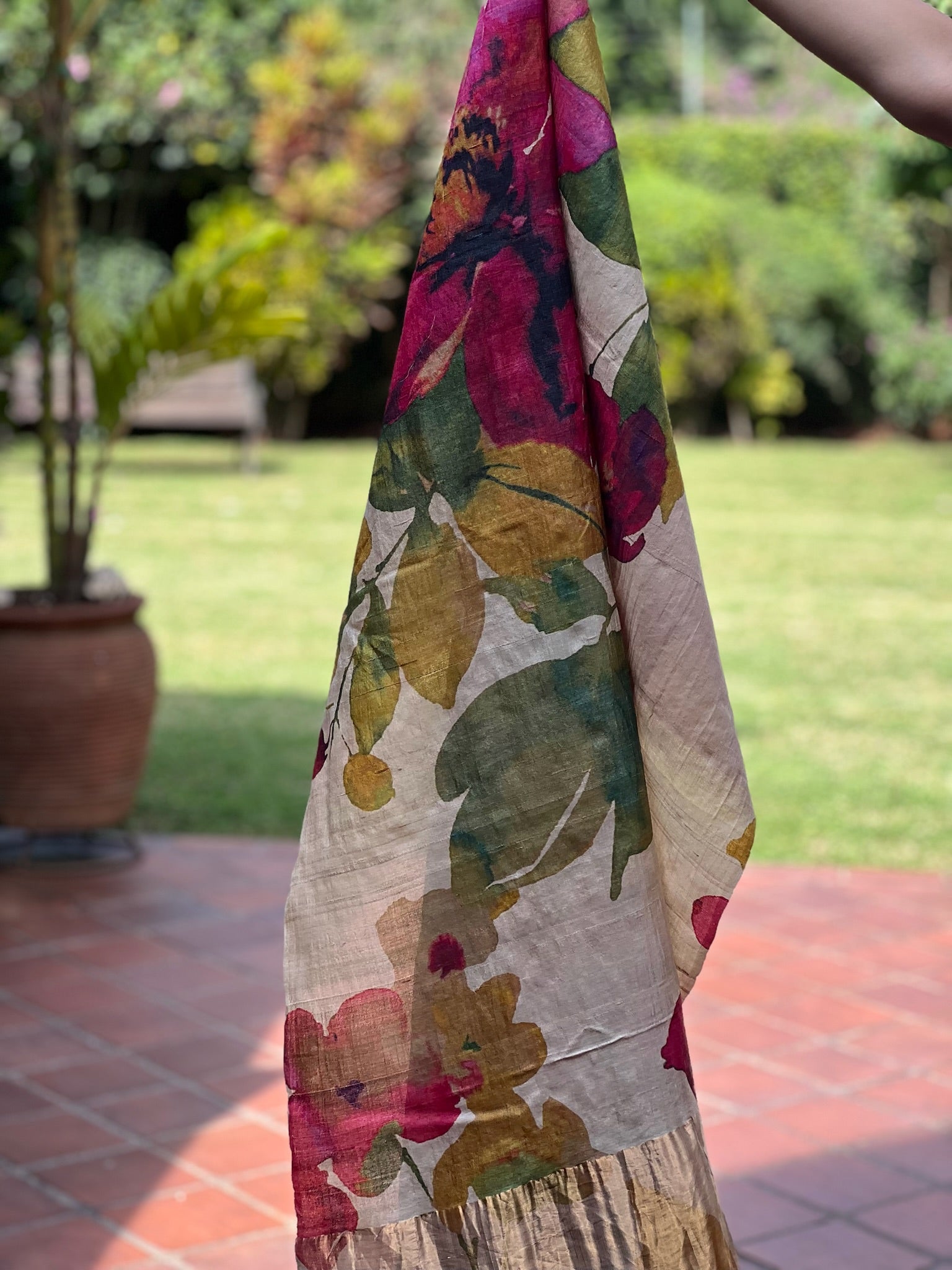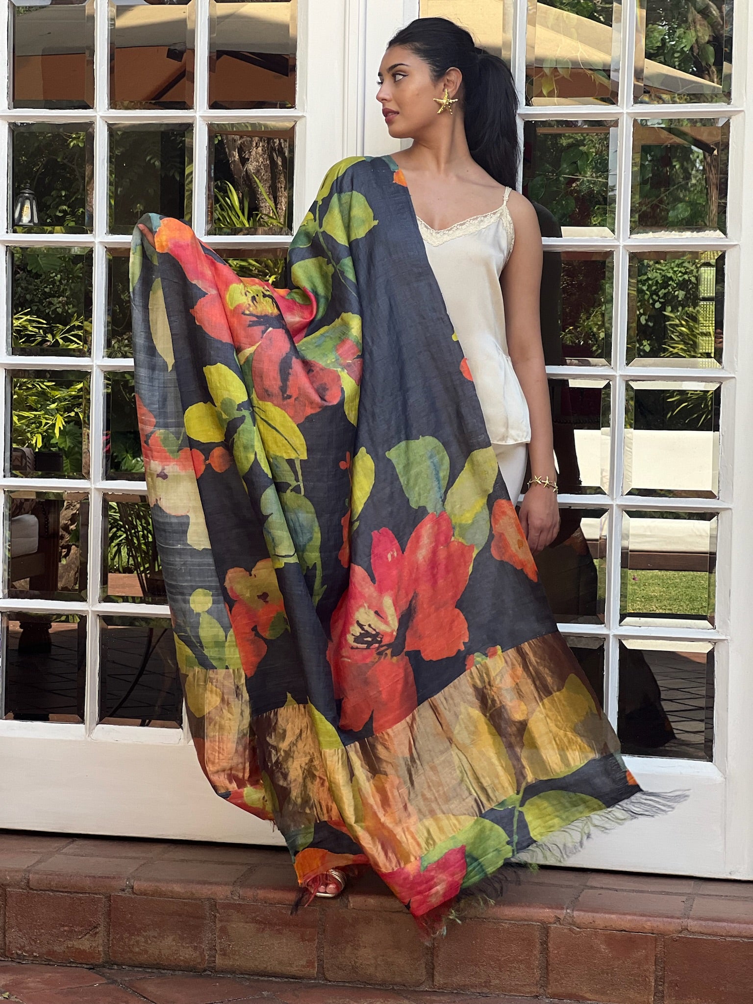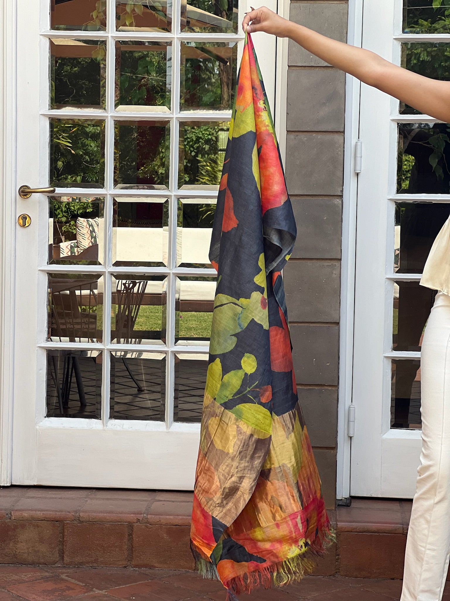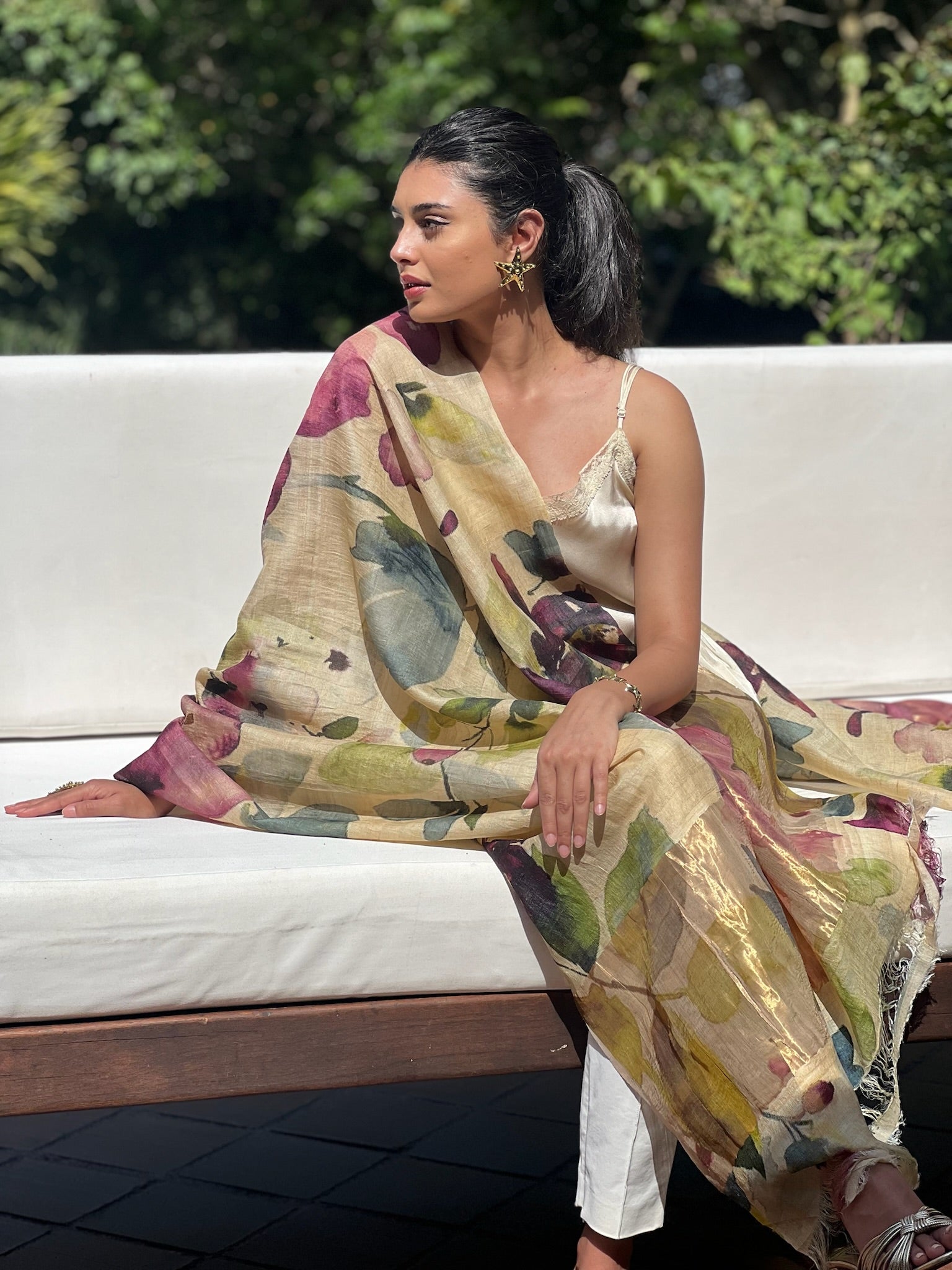 This floral silk shawl with real gold thread is the perfect accessory to glam up basically any outfit. True to the Safarahh style the bright colours make a fabulous statement and the added bonus is the shawl will take you from day to night.
