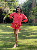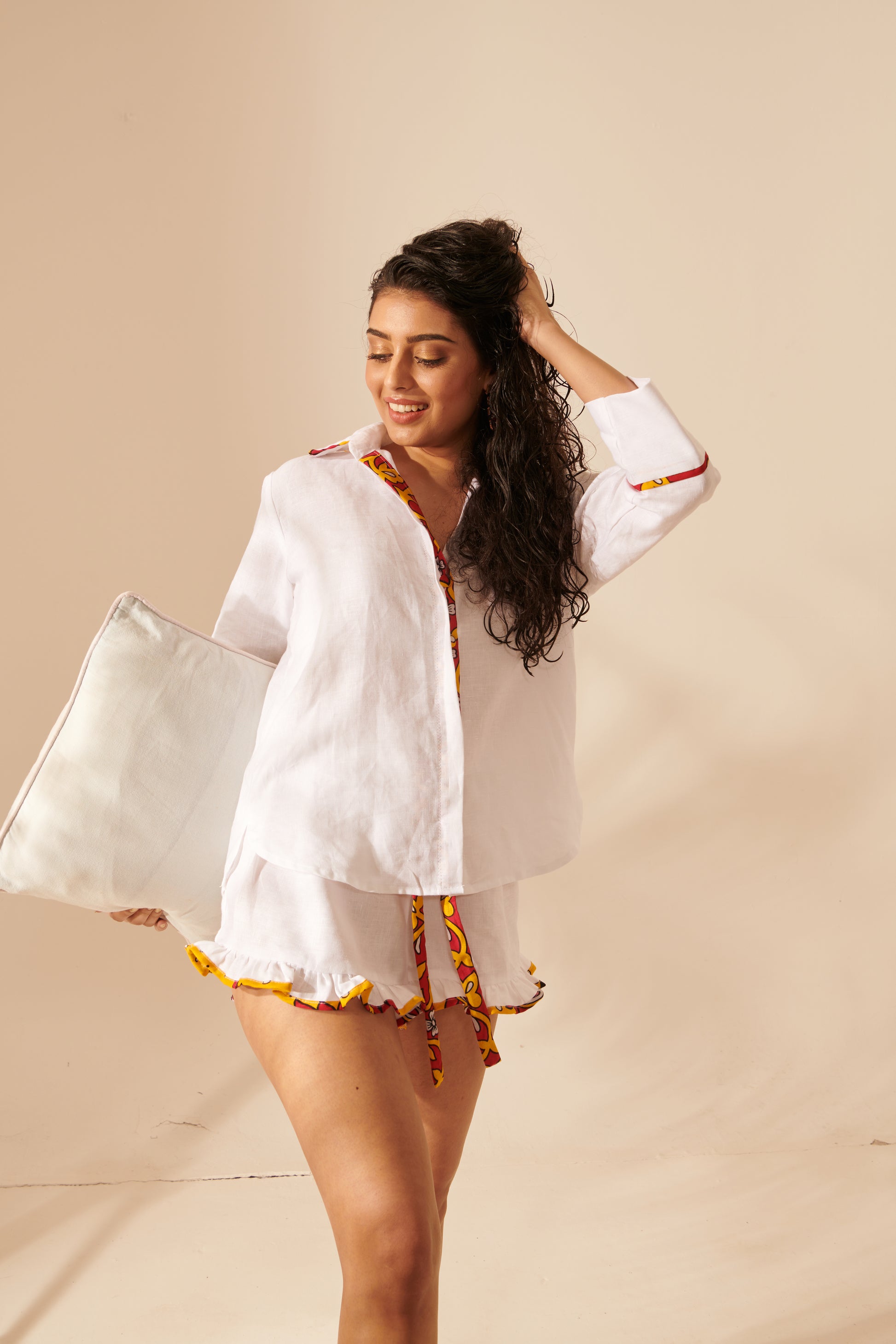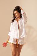 Our Salama pyjama shirt has been inspired by a sleep-chic look, but we think it’s too pretty to stay in bed. We love to pair it with our Salama pyjama shorts, a cute bag and some sandals when on holiday, or tied up with jeans in the city. If you do want her for snoozing, then add her to the bag; she’s comfy, cute and perfect for a girly weekend away.